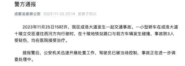 2023年11月25日15时许,我区成洛大道发生一起交通事故。一小型轿车在成洛大道十陵立交匝道往西河方向行驶时,在十陵地铁站路口与前方车辆发生碰撞,事故致3人受轻伤,均在医院接受治疗。