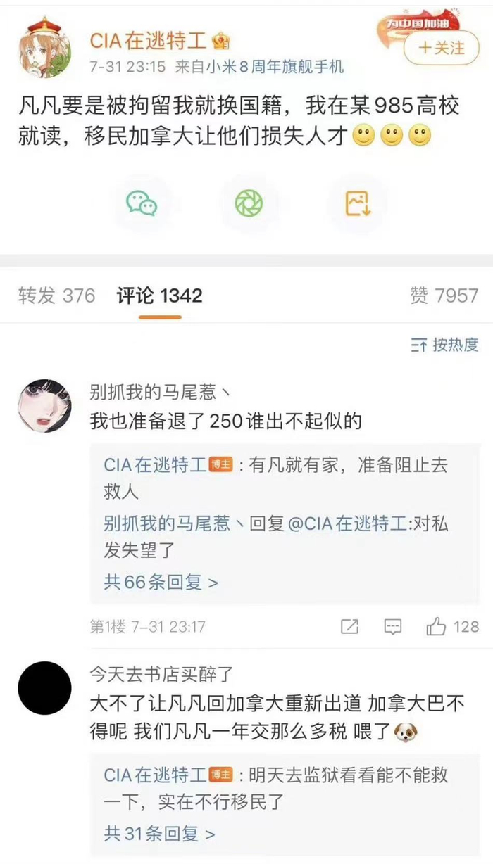 而就在当天晚上,那些铁杆们粉丝就说了:我在985高校就读,敢拘留凡凡我就换国籍,移民加拿大让我们损失人才。