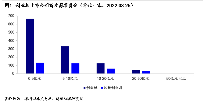 根据海通证券金融工程团队报告《与创新创业企业共同成长》,深圳证券交易所于2022年8月25日披露,创业板上市公司首发募集资金累计超7500亿元,平均首发募集资金6.46亿元,其中,注册制下新上市公司首发募集资金近3300亿元,平均首发募集资金9.26亿元。