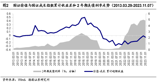 据此,我们将价值风格相对成长风格的超额收益走势和2年期美债利率对比。如图2所示,2013.03.29-2023.11.07期间,两者显著正相关,相关系数高达25%。两个美债利率上行周期内(2016.03.01-2018.07.01;2022.03.01-2023.07.01),A股市场的价值风格明显优于成长风格;而下行周期内(2019.12.31-2021.09.30),成长风格的表现则更为出色。