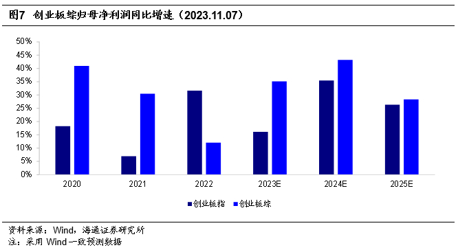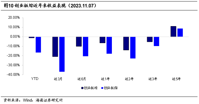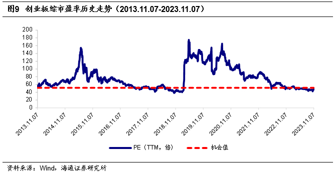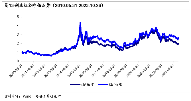 综上所述,我们认为,在美联储有望结束加息周期、成长和价值指数之间的相对盈利差似有触底反弹之势和低估值因子拥挤度正从历史高位下行,三个因素的共同驱动下,未来6-12个月,A股市场或将迎来新一轮成长风格的周期。因此,“主要服务成长型创新创业企业,支持传统产业与新技术、新产业、新业态、新模式深度融合”的创业板具备较高的投资价值。