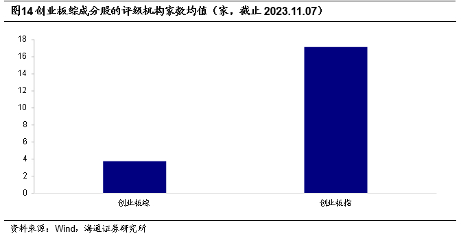 对比创业板指,机构对创业板综成分股的覆盖度较低。如图14所示,截至2023.11.07,对创业板综成分股给出投资评级的机构家数平均为3.7家,显著小于创业板指(17.1家)。我们认为,和创业板指相比,创业板综成分股可能仍存在一定程度的定价偏差,这意味着量化策略在该领域的潜在超额收益空间更大。