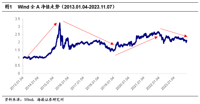 我们以国证风格指数代表A股市场较为常见的6种投资风格,验证在各市场环境下,不同投资风格的表现。首先,我们把Wind全A视作市场指数,将其2013.01.04-2023.10.26的净值走势粗略分为4个阶段:2013.01.04-2015.06.12,2019.01.30-2022.01.04为市场上行阶段;2015.06.15-2019.01.29,2022.01.05-2023.11.07为市场下行阶段。