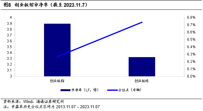 截至2023年11月7日,创业板综的市净率(LF,PB)为3.33倍,低于创业板指(3.9倍);指数目前的估值位于近十年的6.74%分位点,与创业板指(6.27%)基本持平,均处于历史低位,估值性价比较高。