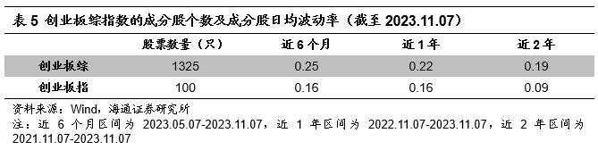 我们将创业板综和创业板指视为投资组合,采用经典的Fama-French五因子模型,检验指数2012.12.31-2023.11.07的投资风格。如表4所示,创业板综和创业板指均在小市值因子上存在正向暴露,而在低估值、盈利和投资因子上暴露为负,与创业板新兴科技股较多的特点相符,具备鲜明的成长属性。值得注意的是,创业板综在小市值因子上的暴露度为43.78%,远高于创业板指(2.46%),说明创业板综的市值覆盖面更广,整体市值偏小,中小盘成长风格更加突出。
