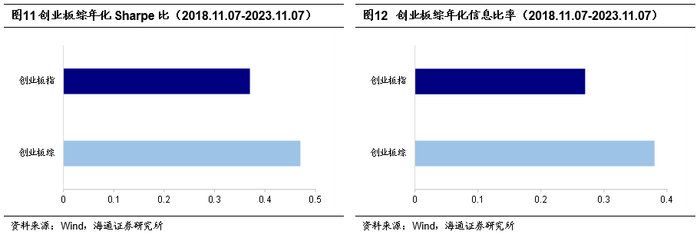 经风险调整后,创业板综的Sharpe比率为0.47,信息比率为0.38,均高于创业板指(0.37,0.27)。