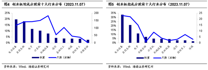 从申万一级行业分布来看,截至2023年11月7日,创业板综共覆盖29个行业,权重最高的四个行业依次为电力设备、医药生物、电子和计算机,占比分别为19.8%、18.2%、11.8%和10.4%,单个行业权重最高不超过20%,前四大行业占比合计60.1%,行业分布较为均衡。而创业板指共覆盖17个行业,其中,权重最高的四个行业分别为电力设备、医药生物、电子和非银金融(33.3%、21.1%、11.1%和7.0%),权重合计占比高达72.4%,行业集中度相对较高。