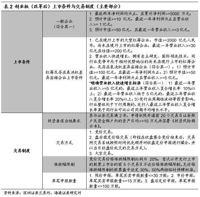 下表详细展示了创业板(改革后)对于不同类型企业的上市条件与交易制度。