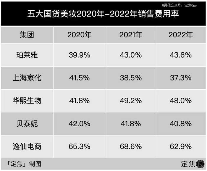 头部国货美妆的财报直观地反映出这一点:销售费用率普遍很高,每年至少拿出四成以上的营收砸在市场营销上。