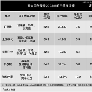 从2023年前三个季度的营收总和来看,珀莱雅以52.5亿超过了曾经的国货美妆老大上海家化,上海家化以50.9亿退居第二。当然,最终2023年年度冠军属于谁,还要等四季度的成绩单。