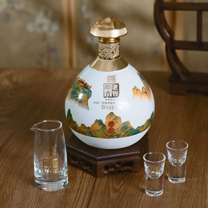 烫金大字的老窖醇香+立体金山瓶盖更显品质。就算平时摆在柜子里都像是一件艺术摆件。
