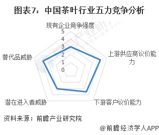 从五力竞争模型角度分析,目前,茶叶属于传统行业,受新兴替代品威胁较大;现有竞争者数量多,竞争风险高;现阶段茶叶市场供过于求,且行业上游一体化能力较强,故对上游供应商议价能力较强;同时,因行业准入资质以及资金、技术门槛一般,但盈利前景也较弱,故行业吸引力一般,潜在进入者威胁较小。