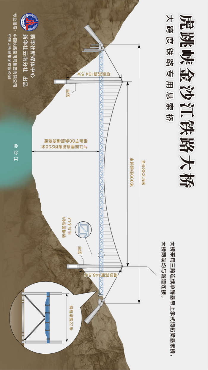 虎跳峡金沙江铁路大桥,全长882.5米,主跨跨径660米,两端均与隧道连接。大桥主缆跨度大、钢梁自重大,两岸山坡陡峭,施工场地有限。