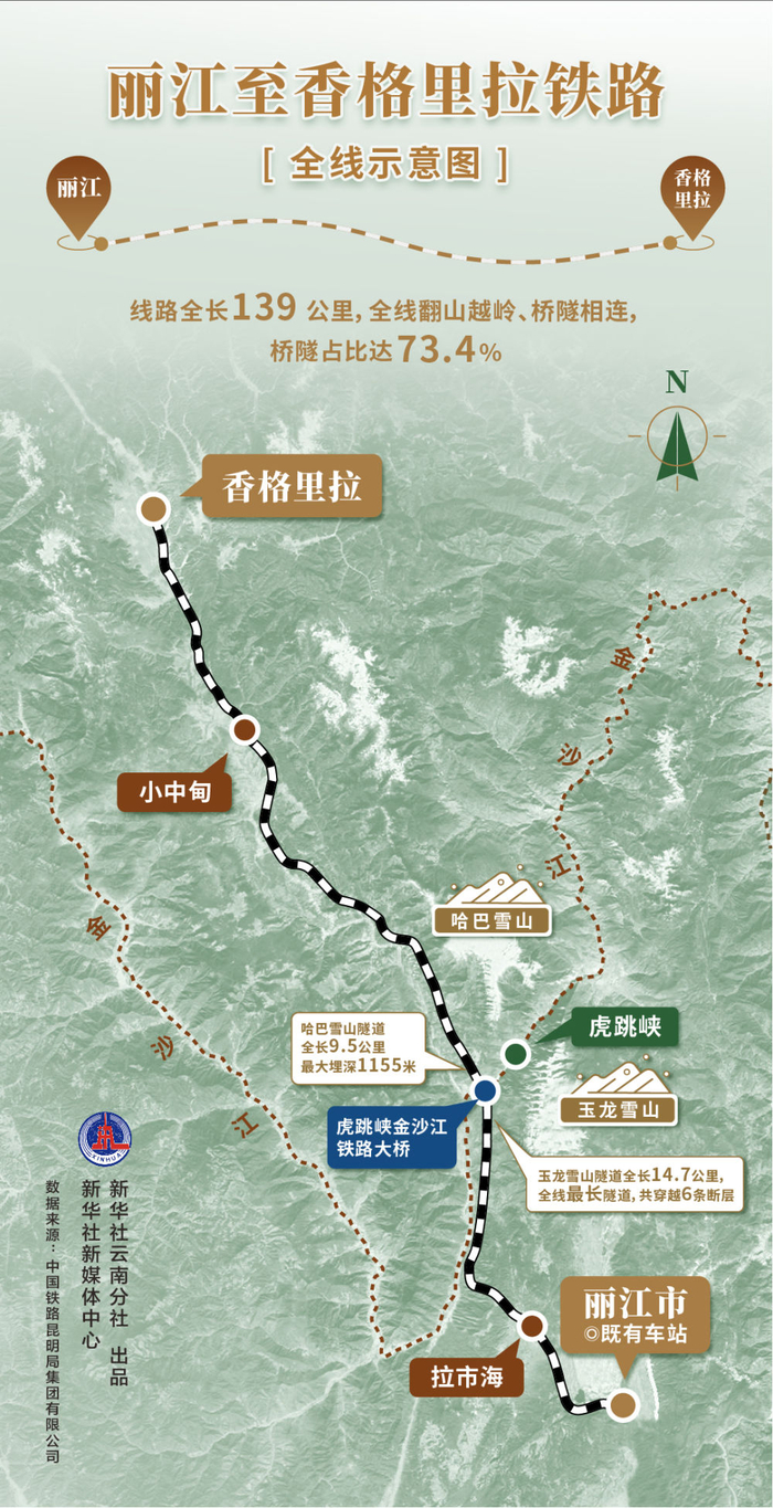 丽香铁路自丽江引出,向北穿越“积玉堆琼”的玉龙雪山,经虎跳峡跨过金沙江,穿过雄奇险峻的哈巴雪山,从小中甸进入香格里拉。