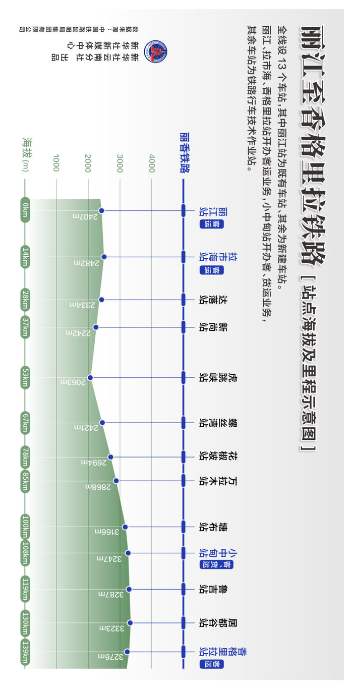全线共设有13个车站,其中丽江站为既有车站,其余为新建车站。丽江、拉市海、香格里拉站开办客运业务,小中甸站开办客、货运业务,其余车站为铁路行车技术作业站。