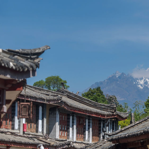 丽江古城的飞檐翘角和玉龙雪山相互掩映(资料照片)。新华社记者 胡超 摄