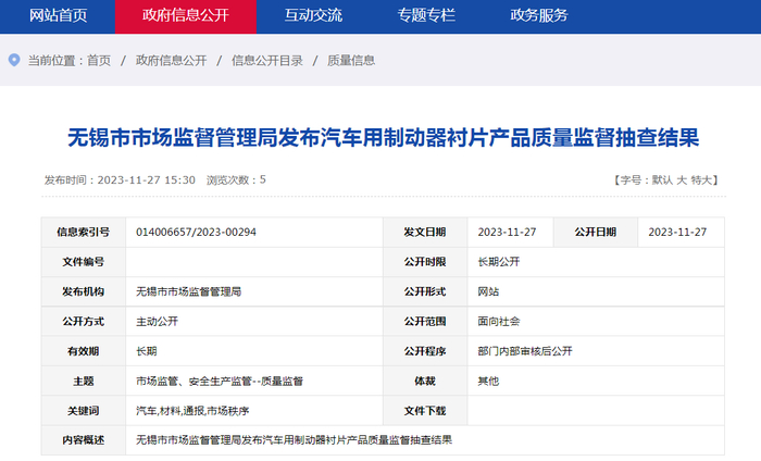 无锡市市场监督管理局发布汽车用制动器衬片产品质量监督抽查结果