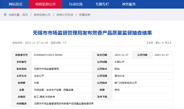 无锡市市场监督管理局发布燃香产品质量监督抽查结果