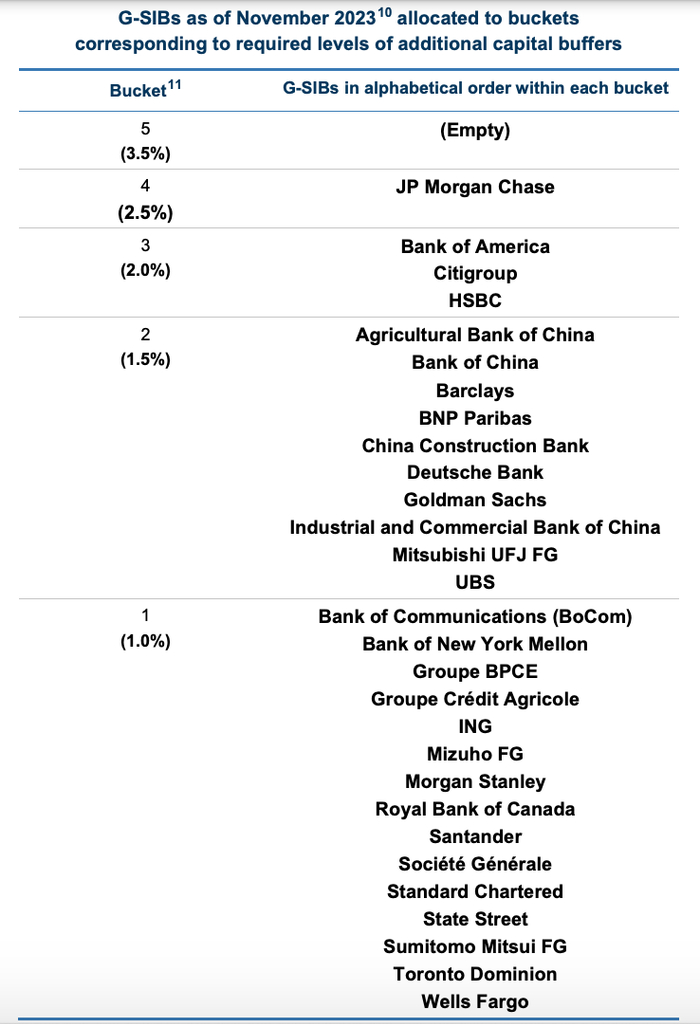 按照规则,上述银行应于2025年1月1日起满足新的附加资本要求。目前G-SIBs自第五组至第一组的额外资本要求分别为3.5%、2.5%、2.0%、1.5%、1.0%。