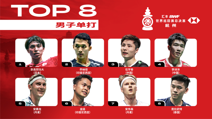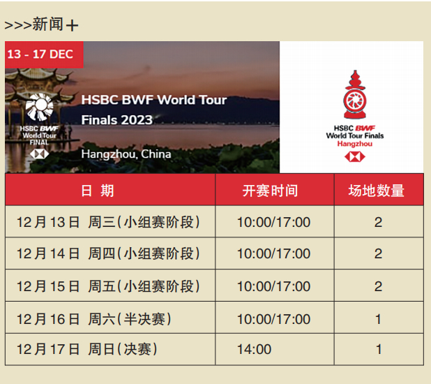 2023年世界羽联世界巡回赛总决赛将在12月13日-17日于杭州奥体中心体育馆举办,分为男单、女单、男双、女双和混合双打五个项目。