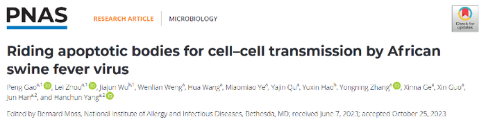 2023年11月20日,中国农业大学动物医学院兽医公共卫生安全全国重点实验室杨汉春团队在《美国科学院院报》(PNAS)上在线发表了题为《非洲猪瘟病毒利用凋亡小体进行胞间传播》(Riding apoptotic bodies for cell-cell transmission by African swine fever virus)的研究论文。论文对非洲猪瘟病毒(ASFV)的感染和传播途径进行了研究,发现ASFV劫持宿主细胞胞葬途径,利用凋亡小体进行胞间传播,进而逃逸抗体中和作用。研究结果为阐释ASFV体液免疫逃逸机制提供了科学依据,对新型疫苗创制也具有启示作用。