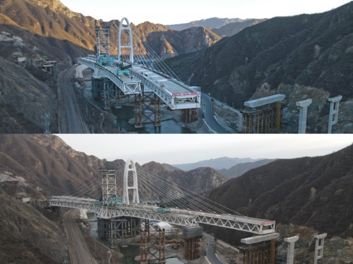11月28日下午,位于北京市门头沟区王平镇安家庄村的国道109新线高速公路工程安家庄特大桥上跨丰沙铁路转体桥顺利转体。在4台千斤顶的牵引下,钢桁梁左、右幅分别向逆时针旋转25°、24°后到达设计接收墩位置。自此,这座墩顶双转体曲线钢桁梁斜拉桥成功跨越丰沙铁路、永定河、109国道,犹如“云帆”矗立在永定河上,为京西再添城市新地标。