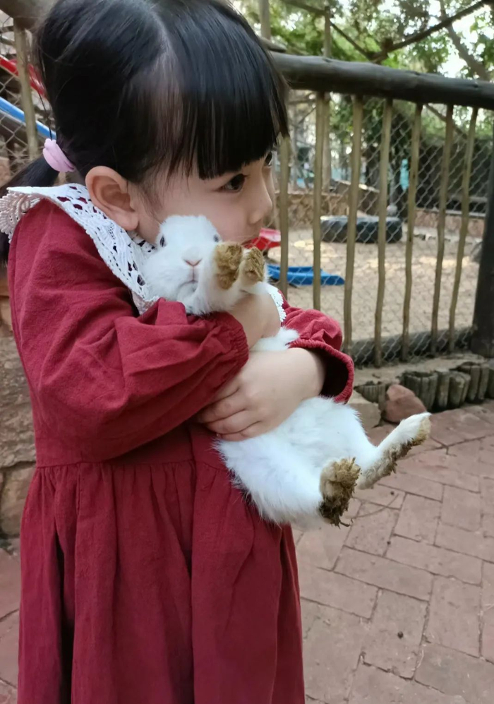 家里养了兔子和狗,她说狗是她姐姐,兔子是她哥哥。得到一块饼干也要分给它们。下雨了第一时间想到它们。