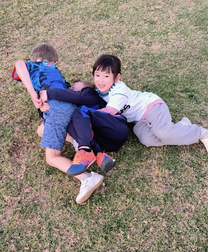 足球课上,玉米的白人小朋友们平时很温柔,一起踢球来就化身狂战士。有次玉米被一个小男孩撞倒,教练把小男孩叫过去训话,玉米反倒觉得奇怪,因为她觉得足球场上发生冲撞很正常,她一点也不认为自己需要被让着。