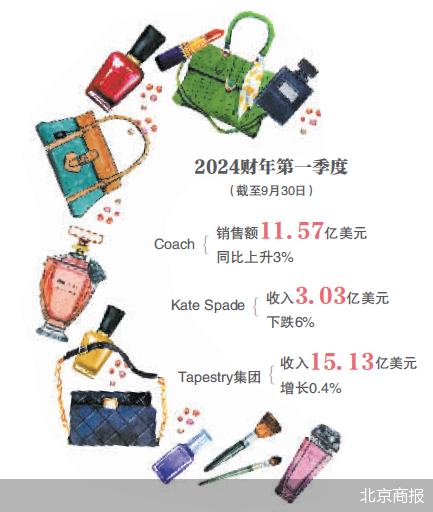 相较之下,另一轻奢元老品牌的业绩表现则相对乐观。在截至9月30日的2024财年第一季度,Coach销售额同比上升3%至11.57亿美元;Kate Spade收入虽然下跌6%至3.03亿美元,但跌幅仍低于Michael Kors,母公司Tapestry集团整体收入增长0.4%至15.13亿美元,其中大中华市场的增幅为9%。