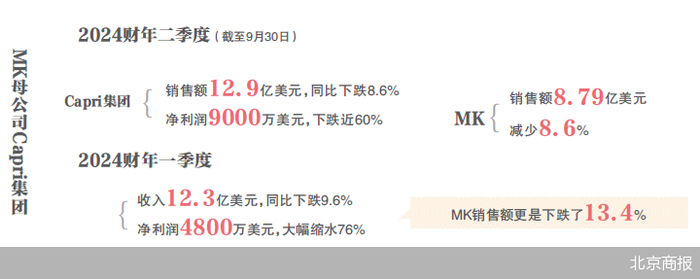 从财报情况来看,业绩下滑也成了不争的事实。据MK母公司Capri集团2024财年二季度财报显示,在截至9月30日的三个月内,Capri集团销售额同比下跌8.6%至12.9亿美元,净利润下跌近60%至9000万美元,其中MK销售额也减少8.6%至8.79亿美元。下滑早有显现,2024财年一季度,集团整体收入同比下跌9.6%至12.3亿美元,净利润大幅缩水76%至4800万美元,其中MK销售额更是下跌了13.4%。