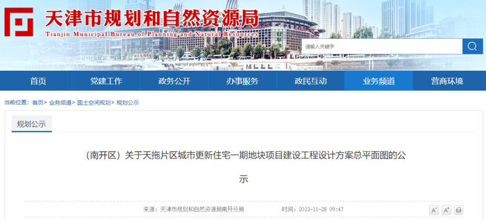 11月28日,天津市规划和自然资源局南开分局发布《关于天拖片区城市更新住宅一期地块项目建设工程设计方案总平面图的公示》——