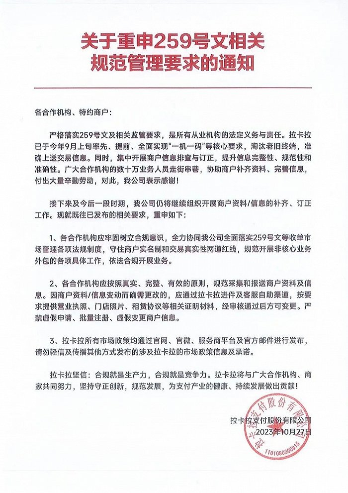 拉卡拉在公告中还表示,已经要求合作机构的数十万业务人员走街串巷,协助商户补齐资料、完善信息。接下来一段时间,仍将继续开展商户资料信息补齐、订正工作。