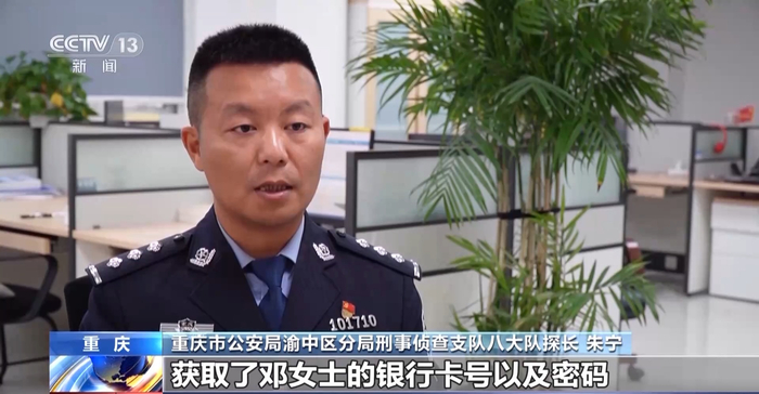 重庆市公安局渝中区分局刑事侦查支队八大队探长 朱宁:邓女士按照诈骗分子的要求,下载手机软件并打开了屏幕共享,诈骗分子就获取了邓女士的银行卡号以及密码,还有验证码。