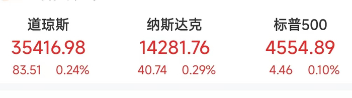 当地时间11月28日,美股三大股指小幅收高。道指涨83.51点,涨幅为0.24%,报35416.98点;纳指涨40.74点,涨幅为0.29%,报14281.76点;标普500指数涨4.46点,涨幅为0.10%,报4554.89点。