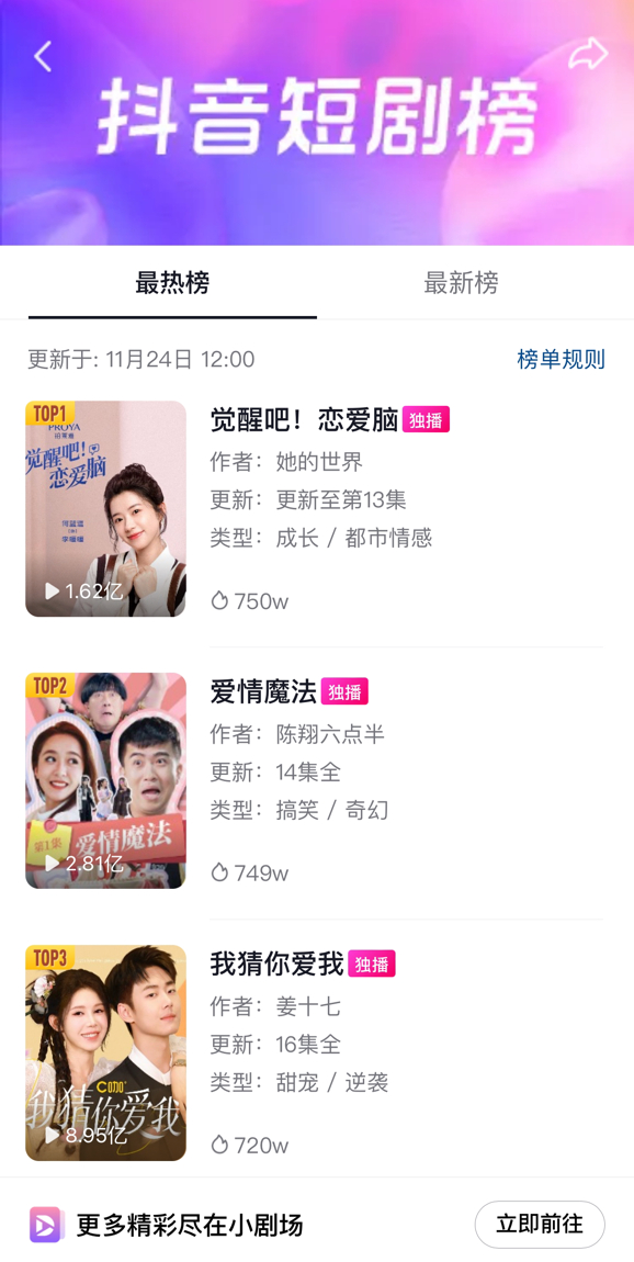接力《全职主夫培养计划》,同样由完美世界旗下影视短剧厂牌“她的世界”出品的《觉醒吧!恋爱脑》高居抖音短剧最热榜TOP1,同时其与优酷等长视频平台合作的微短剧《当家小娘子》《皎月流火》《这个反派我不干了》也会在近期陆续上线。