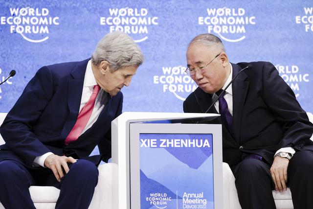 当地时间2022年5月24日,瑞士达沃斯,中国气候变化事务特使解振华与美国总统气候问题特使克里共同出席世界经济论坛年会(达沃斯论坛)有关气候变化的对话会。图/IC photo