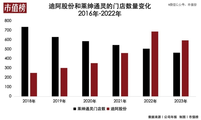 今年迪阿股份门店数量减少94家至594家,莱绅通灵减少44家至463家。