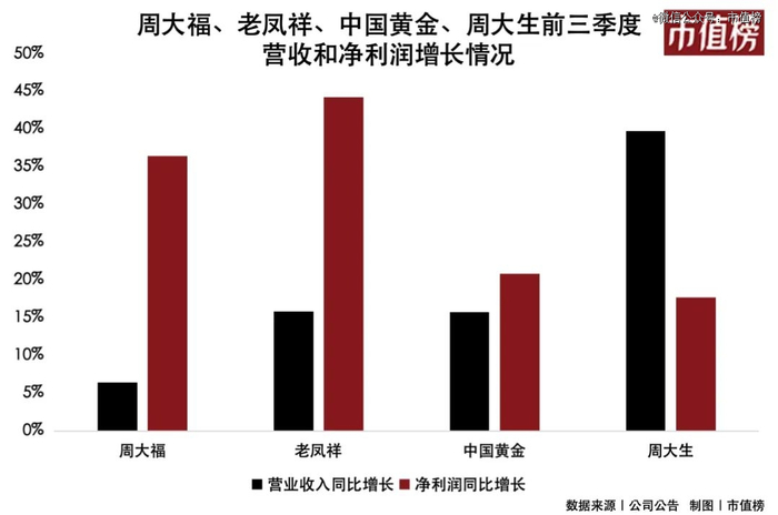 从已披露的财务数据看,周大福(2023.4.1-9.30)营业收入同比增长6.43%,老凤祥同比增长15.9%,中国黄金同比增长15.76%,周大生同比增长39.81%。