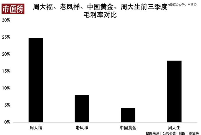 黄金是一种硬通货,有国际金价指导,开采和加工的价格也相对透明,可以说,下游黄金流通品牌,都是价格的被动接受者,品牌溢价不算明显,整体的毛利率也比较低。