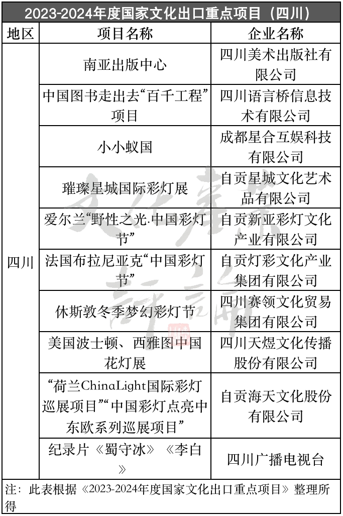 值得注意的是四川省作为一个西部省份,在此次文化出口重点项目的评选中成绩十分亮眼,入围的重点项目10个(详见下表),甚至超越了广东、江苏、浙江。其中6个项目涉猎国家级非物质文化遗产——灯彩文化,再一次印证了中国特色传统文化的国际市场。