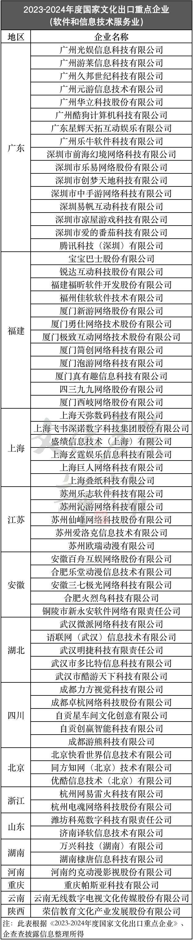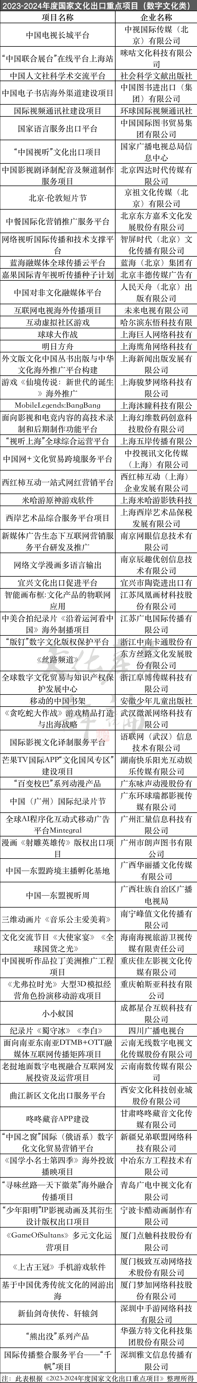文化出口不仅成为中华文化“走出去”的重要路径、更成为拉动国民经济在后疫情时代增长的重要支撑。10月商务部等四部门颁布《关于2023-2024年度国家文化出口重点企业和重点项目的公告》,公布了最新一批367家文化出口重点企业、115个文化出口重点项目。本文将根据此次公布的企业信息结合重点项目,对我国文化出口现状及未来发展态势进行简要梳理及预测。
