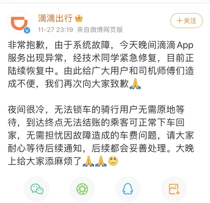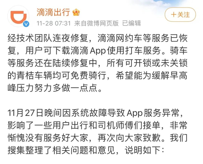 @滴滴出行 11月29日发布消息:11月27日夜间发生的系统故障,给广大用户造成了诸多困扰和不便,在大家需要我们的时候,我们让大家失望了,再次向大家真诚致歉。