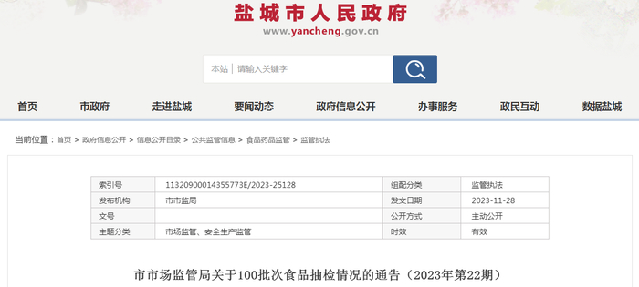 江苏省盐城市市场监督管理局关于100批次食品抽检情况的通告(2023年第22期)