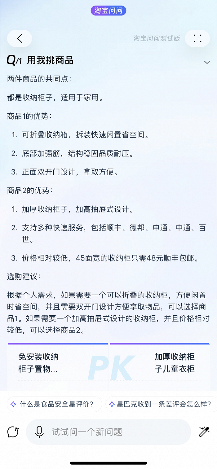 中间层则是一些技能卡,包括「用我挑商品」、「婚礼策划师」、「旅行策划人」、「生活小能手」、「文案达人」等聚焦更细分场景的插件。在「用我挑商品」中,用户可以选择购物车里的同类商品进行比较,淘宝问问能够综合商品介绍、用户评价、下单人数等信息进行比较,给出一个理由更充分的购买建议。