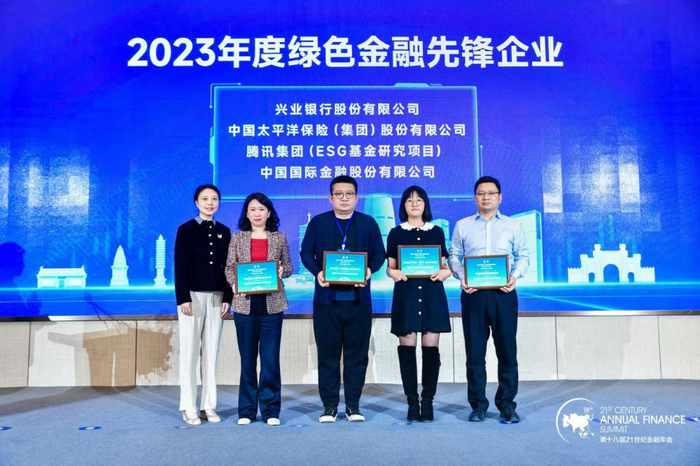 兴业银行股份有限公司、中国太平洋保险(集团)股份有限公司、腾讯集团(ESG基金研究项目)、中国国际金融股份有限公司共计四家企业获评2023年度绿色金融先锋企业。