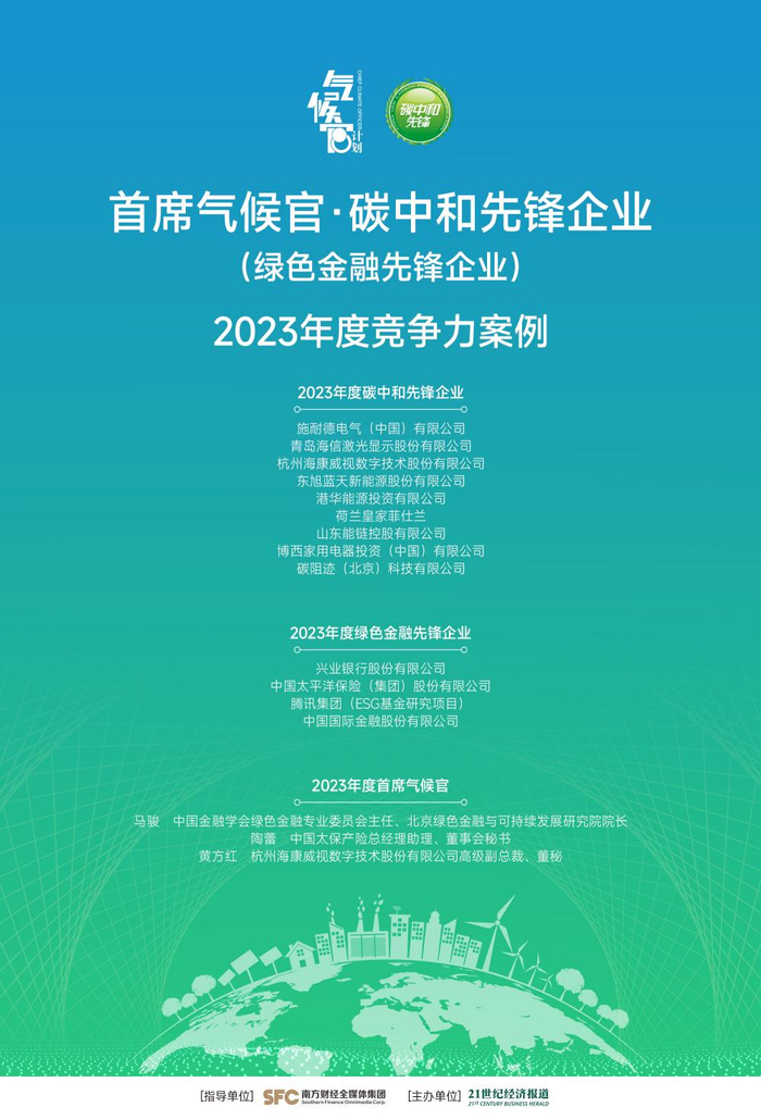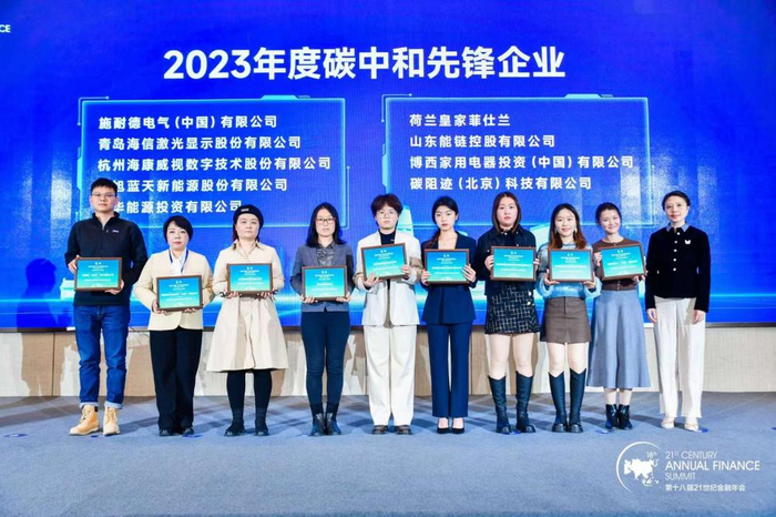 施耐德电气(中国)有限公司、青岛海信激光显示股份有限公司、杭州海康威视数字技术股份有限公司、东旭蓝天新能源股份有限公司、港华能源投资有限公司、荷兰皇家菲仕兰、山东能链控股有限公司、博西家用电器投资(中国)有限公司、碳阻迹(北京)科技有限公司共计九家企业获评2023年度碳中和先锋企业。