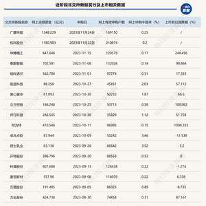 网上冻结资金方面,上周发行的机科股份、广厦环能的网上冻结资金规模都超过了千亿(分别为1181亿元、1348亿元),为2022年3月以来的最高水平。相比之下,在今年9-10月间发行的多只北交所新股的网上冻结资金都不足百亿。