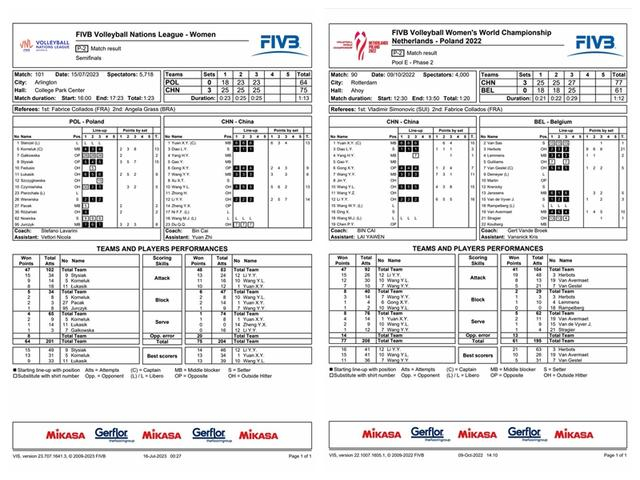 2023年世界女排联赛和2022年女排世锦赛,两场中国女排比赛的P2表。 图/国际排联官网