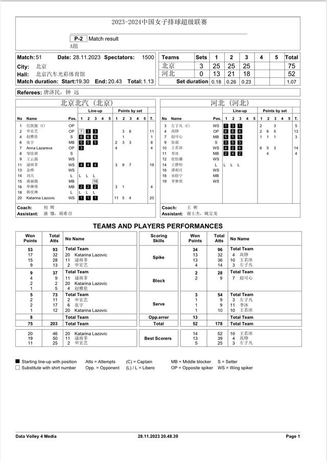 11月28日晚,北汽女排对阵河北女排的P2表。 图/中国排协官网