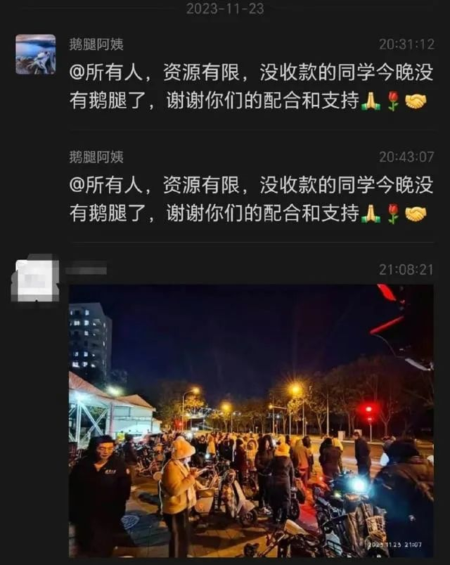 11月28日晚上11点29分,鹅腿阿姨在群聊内发信息称:“对不起,这几天都不做,太乱了”,称给没有取鹅腿的同学退钱。据现场值班保安介绍,之前,阿姨每晚九点左右出摊,有时凌晨一点还在守摊。走红这几天,不到一小时就能卖完收摊。